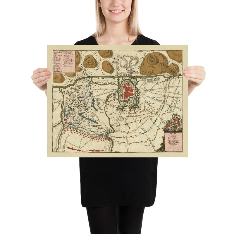 - Design/style context: Detailed artistic representation typical of 17th–18th-century cartography; uses color to indicate troop positions and terrain; features an ornate cartouche with heraldic symbols.