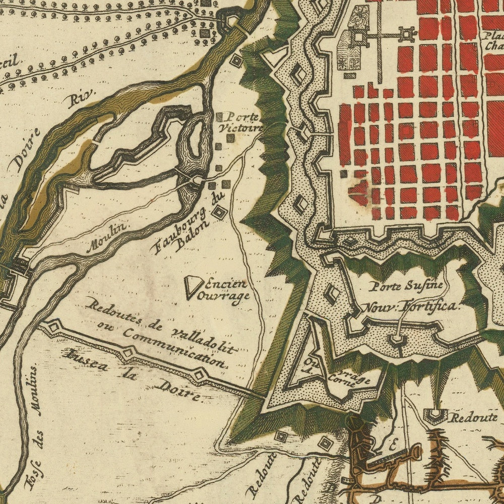 - Fortifications: The city’s defensive walls and bastions are clearly marked.