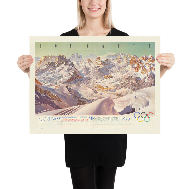 Heinrich Berann’s Cortina - VII Olympic Winter Games panorama is an exquisite fusion of art and alpine cartography, created at the very moment Cortina d’Ampezzo stepped onto the world stage in 1956. Composed as a sweeping bird’s-eye view, it captures the crystalline geometry of the Dolomites while guiding the eye naturally to Cortina, framed by a symphony of ridgelines. The multilingual title—Italian, French, English, and German—announces its cosmopolitan purpose, welcoming visitors from across Europe and beyond. Berann balances practicality and romance: ski areas are lucidly plotted, yet the scene glows with gradient tones that suggest winter light sliding over snow. The Olympic rings discreetly proclaim the occasion, underscoring the map’s dual life as a working guide and an elegant souvenir of a storied alpine Games.