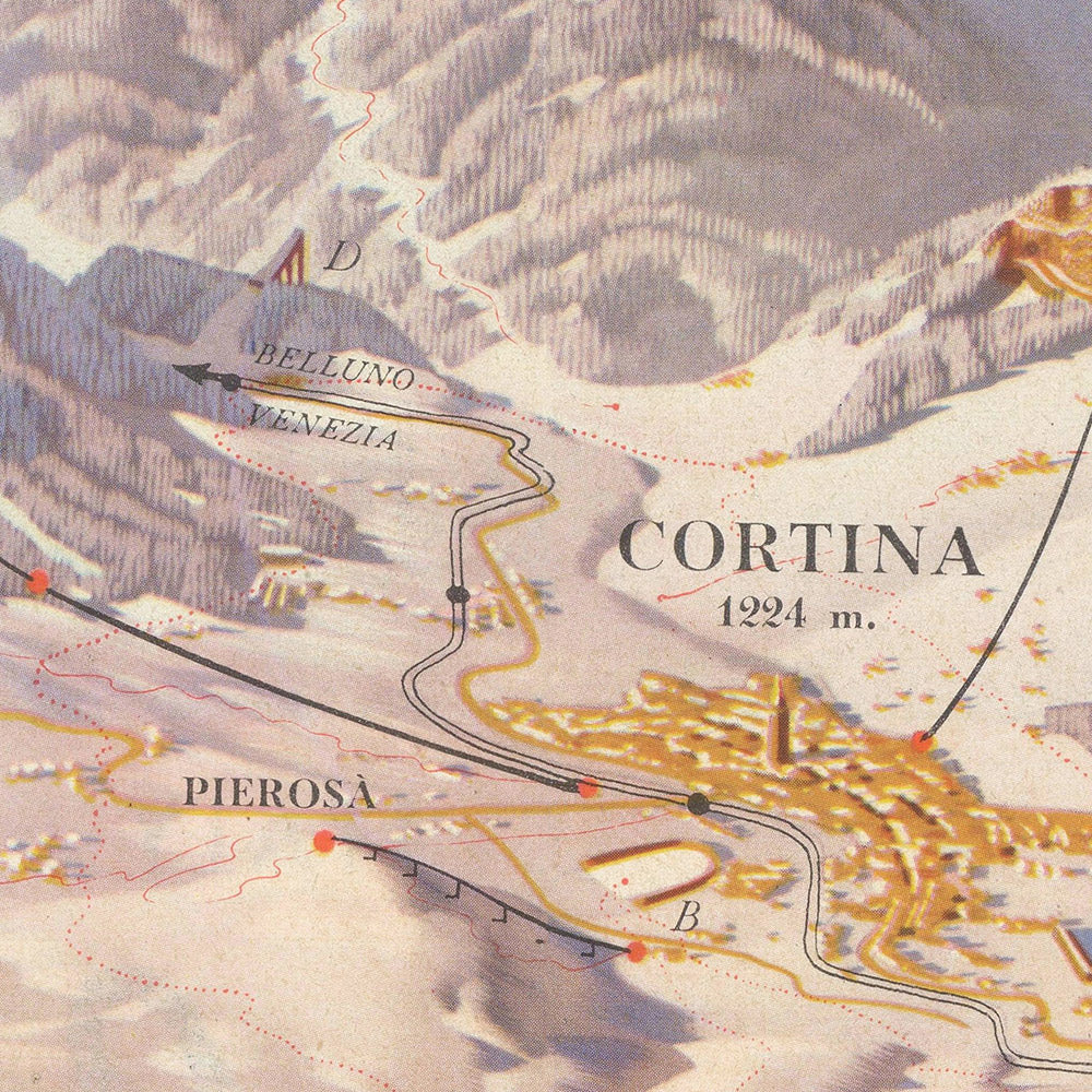 As a historical document, the map freezes a transformative winter. The VII Olympic Winter Games were among the first to be televised across Europe, projecting Cortina’s luminous scenery to a new mass audience and cementing Italy’s postwar renaissance in the Alps. The Soviet Union made its Winter Olympics debut here, reshaping competitive narratives and heralding a new era in sport. Berann’s multilingual labels speak to the Games’ internationalism, while the Olympic rings punctuate the sheet with quiet authority. Together, these elements preserve a precise cultural moment: mid-century Cortina as both glamorous resort and global arena, where the Dolomites became a shared visual language for sport, travel, and aspiration.