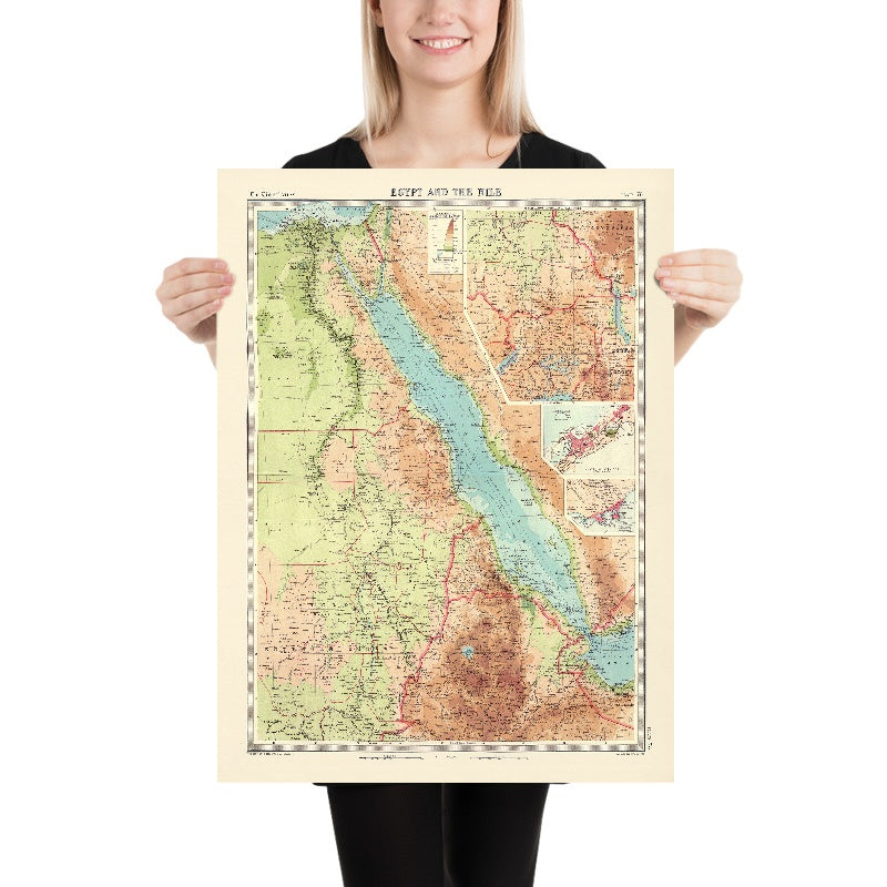 The political framework is drawn with lucid economy. Clearly labeled boundaries delineate Egypt’s borders and internal divisions, while the long southern frontier with Anglo‑Egyptian Sudan is traced with the cartographic assurance that characterized the period. The Sinai land bridge is set apart by both color and relief, emphasizing its role as hinge between Africa and Asia. Insets focused on Alexandria and its environs amplify the story: breakwaters, harbor basins, railheads, and canalized waterways are articulated to reveal the city’s industrial and maritime reach across the Delta. Urban names constellate along the littoral and within the Delta’s lattice of channels, from the approaches to Port Said to the shoulders of Rosetta and Damietta, mapping a landscape where antiquity and modern infrastructure entwine.