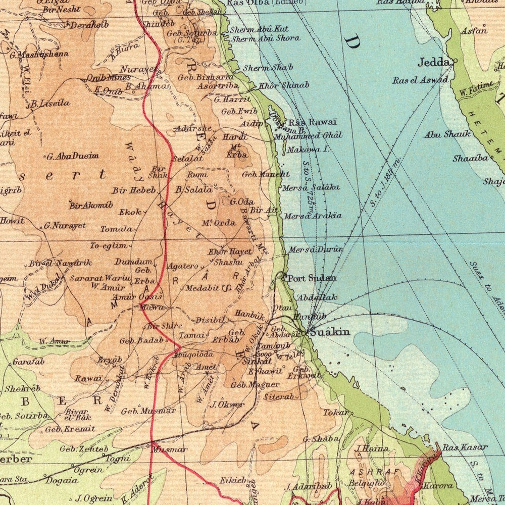 Maritime and communications history animates the sheet. Finely ruled shipping routes stitch the Mediterranean to the Red Sea, converging upon Port Said and Suez before sweeping down toward the Aden region and beyond to the Indian Ocean world. Along these arcs, measured distances speak to the tempo of steam, charting the age of regular timetables and coaling schedules. Submarine cable pathways, the nervous system of empire and commerce, spear outward from Alexandria into the Levant and Europe, and from Suez toward the Arabian Sea, inscribing the invisible threads that compressed continents into hours. On the river itself, marked steamer tracks attest to Nile navigation, a seasonal choreography negotiating barrages and cataracts to bind Upper and Lower Egypt into a single economic spine.