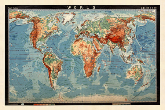Old Physical World Map by G Pohlmann, 1950: Educational Lecture Hall Chart