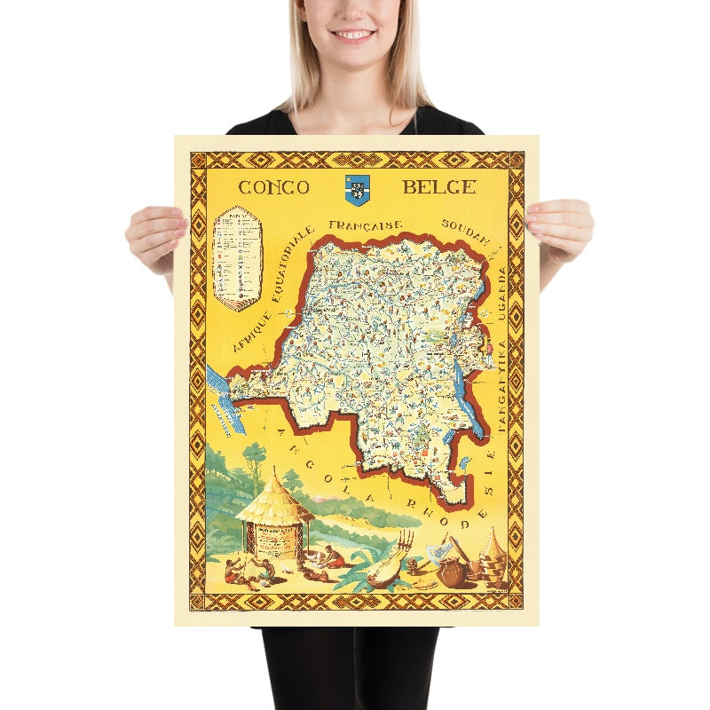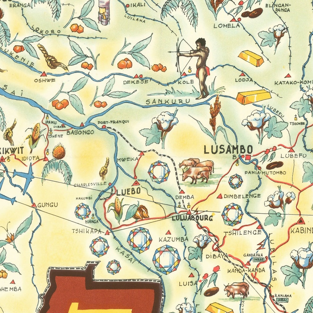 Economic storytelling is everywhere. Clusters of mine symbols and commodity vignettes reveal where the earth was most insistently asked to yield its treasures, with Katanga’s belt and the broader Kasai region—home to centers such as Mbuji-Mayi and Kananga—standing out. Agricultural emblems line fertile valleys, aligning plantation imagery with river corridors. A distinctive advertising panel for Compagnie Maritime Belge, S.A. of Antwerp underscores the transoceanic circuitry that carried goods and people between colony and metropole, and different versions of the map were known to feature alternate advertisers—an eloquent reminder that mid-century cartography often doubled as commercial theater. The message is unmistakable: extraction, cultivation, and shipping formed a single, carefully choreographed system.