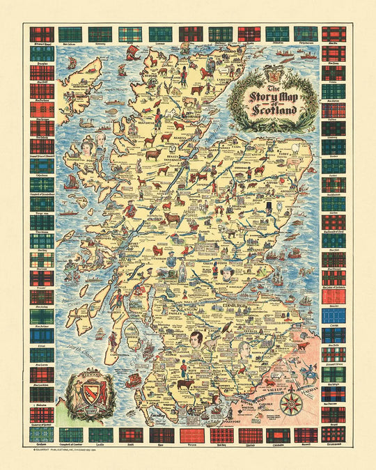 The Story Map of Scotland, crafted in 1935 by Colortext Publications Inc., is a captivating blend of cartography and storytelling. This decorative pictorial map invites you on a journey through Scotland's rich tapestry of history and culture. The map is adorned with illustrations of historical figures, mythical creatures, and significant events, offering a vivid narrative of Scotland's past. Each element is thoughtfully placed to provide a comprehensive view of the country's heritage, making it not just a map, but a visual storybook.