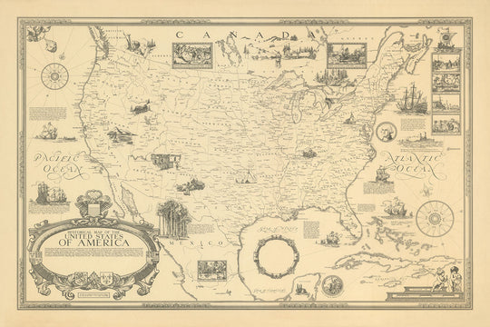 Ernest Clegg's meticulous craftsmanship is evident in every corner of this map. His illustrations bring to life significant historical events and landmarks, from the bustling streets of New York to the serene landscapes of the Pacific Northwest. The map not only charts the physical terrain of the United States but also narrates its storied past through vignettes and decorative elements. Clegg's ability to merge cartographic precision with artistic flair results in a map that is as informative as it is visually stunning.