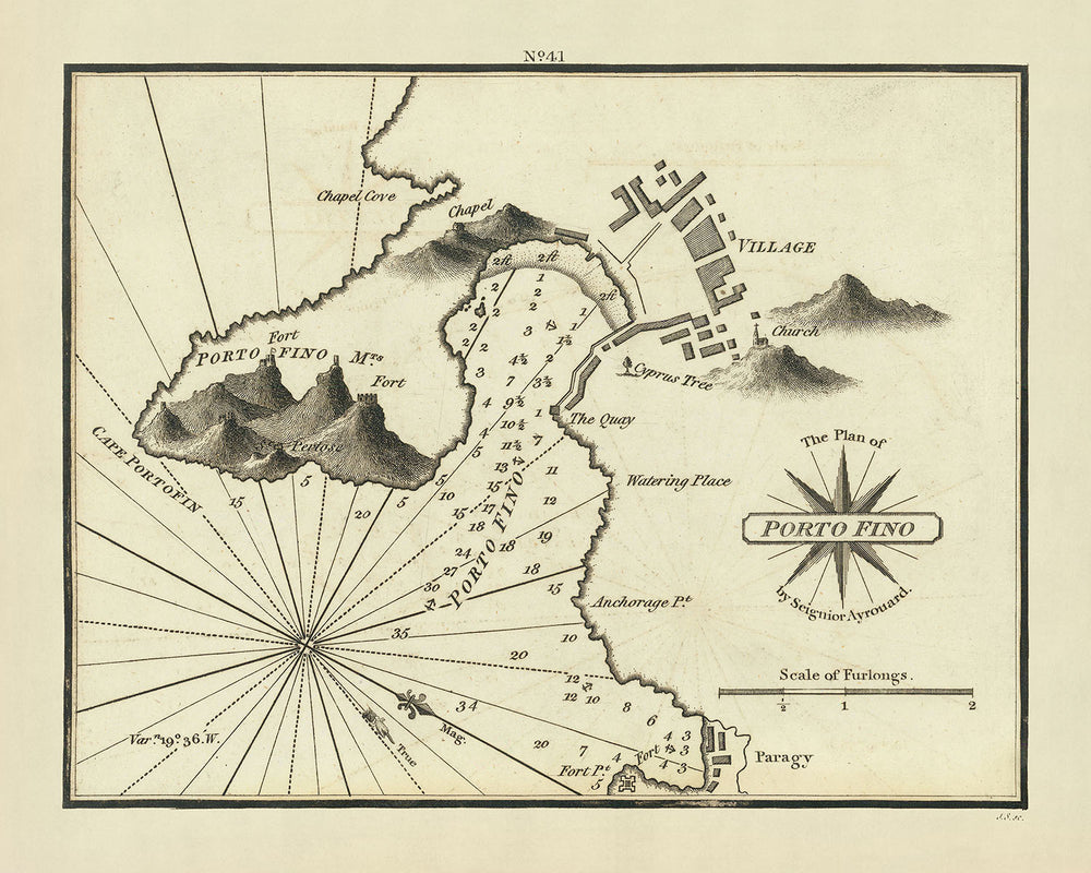 Beyond its utility for navigation, the chart serves as a historical snapshot of Portofino's maritime infrastructure during the early 19th century. It meticulously marks the location of a chapel, a church, and the village layout, offering a glimpse into the daily lives of its inhabitants. The watering place and anchorage point highlighted on the map are indicative of the bustling activity that would have been present as sailors and traders frequented this port. These features not only add depth to the chart’s utility but also enrich our understanding of Portofino’s role in Mediterranean maritime history.