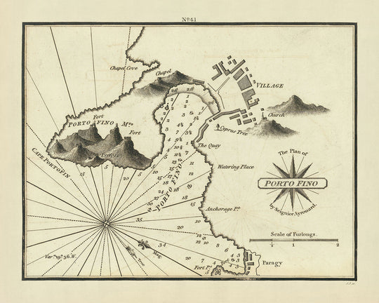 Old Portofino Nautical Chart by Heather, 1802: Italian Riviera, Village, Forts, Soundings