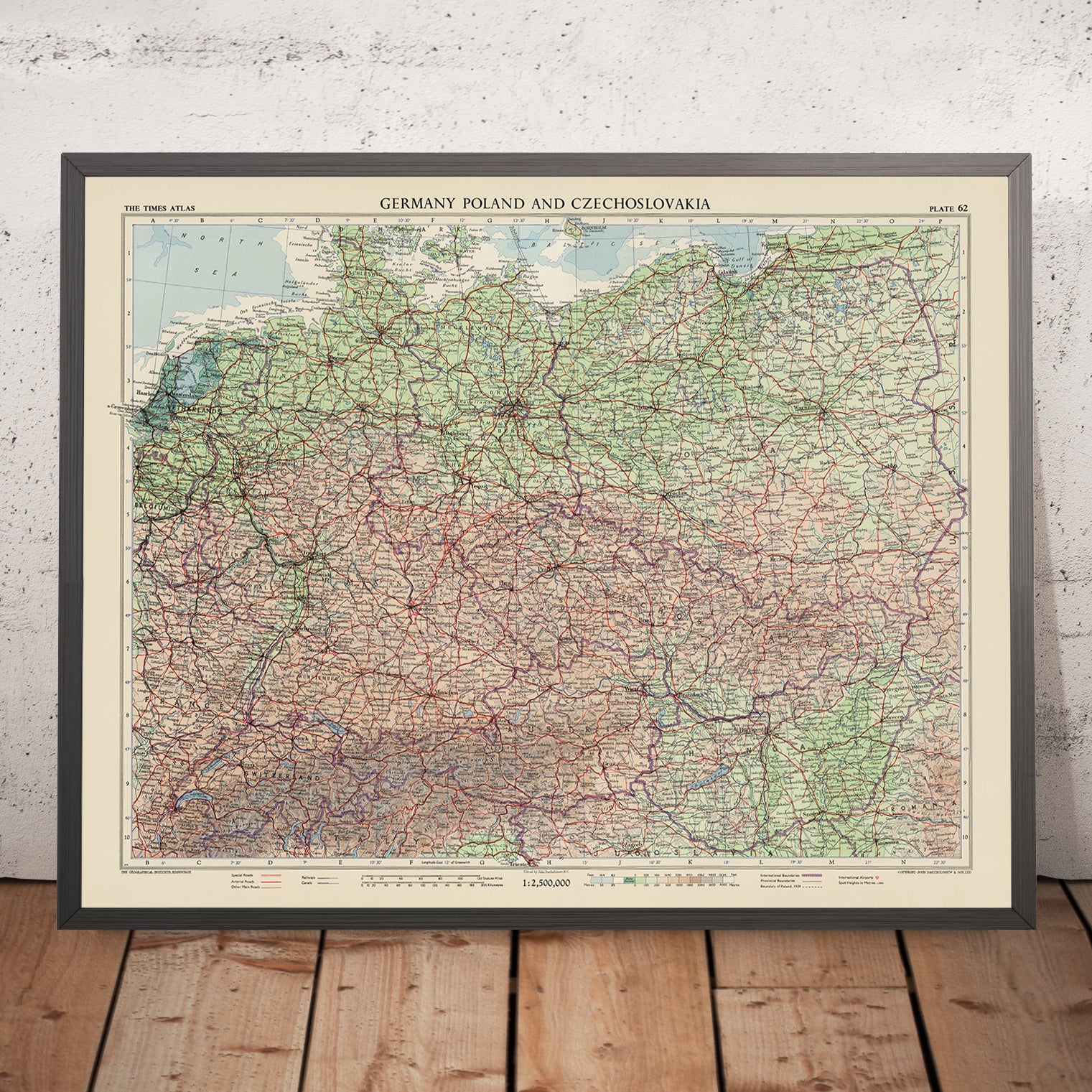 Originally titled “Germany, Poland and Switzerland” (Plate 62, Volume III), this 1955 chart from The Times Atlas of the World captures Central Europe at a decisive mid-century juncture. John Bartholomew’s hand is evident in the union of political clarity and physical drama: borders are crisply drawn while shaded relief and gentle gradient tints lift the Alps, Sudetes, and Black Forest from the page. Provinces and regions are labeled with scholarly precision, from Bavaria and Saxony to Silesia and Masovia, and the road network is color-keyed to anchor the great cities—Berlin, Hamburg, Munich, Warsaw, Kraków, Zurich, Geneva—within their landscapes. Rivers and lakes are traced with hydrological nuance, and maritime gradients fringe the North and Baltic seas, inviting both study and quiet admiration.