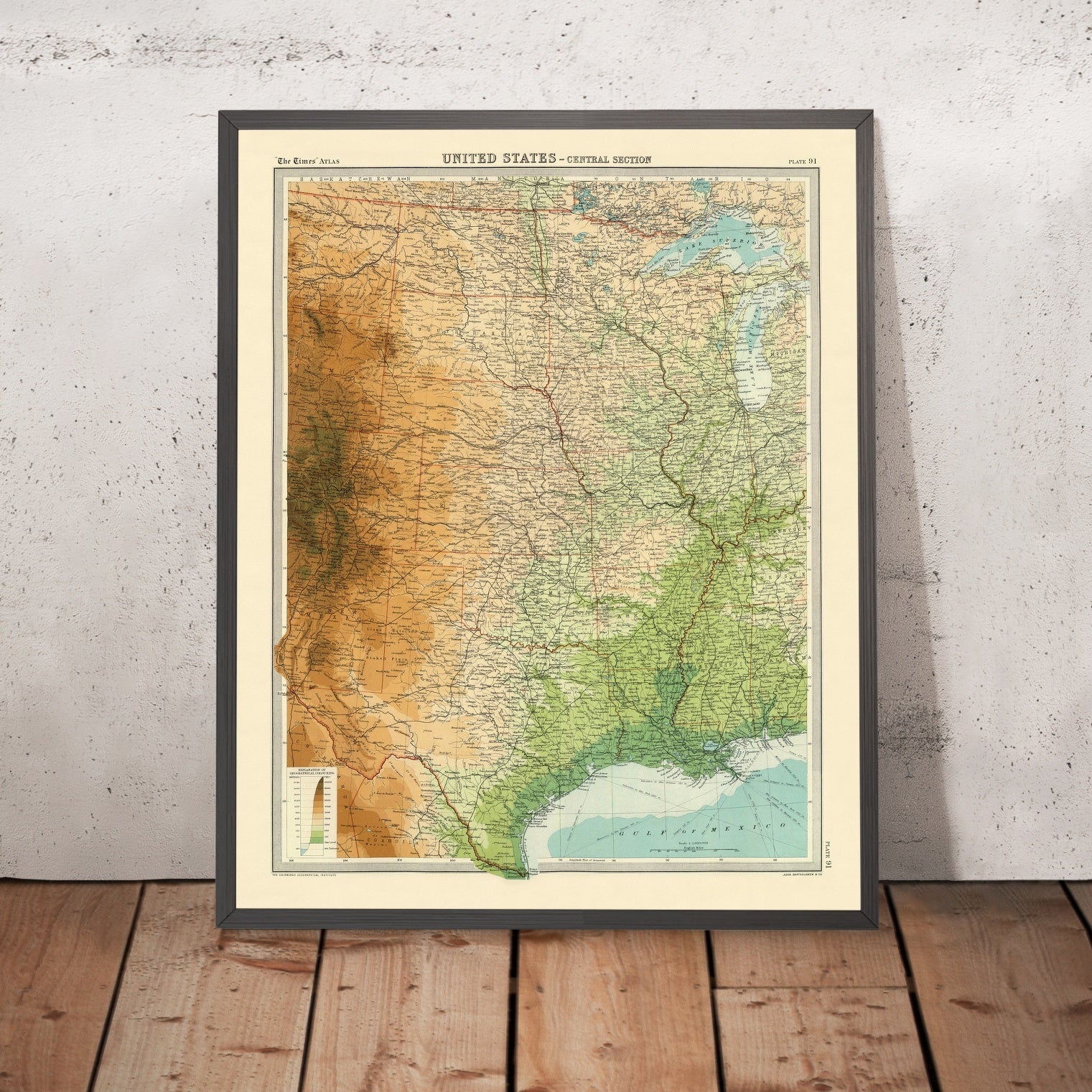 United States - central section is John George Bartholomew’s 1922 vision of the American heartland, issued by the Edinburgh Geographical Institute as the second iteration of the landmark 1920 edition. It marks a decisive stylistic and technical shift from the earlier, Andree-influenced 1895 tradition, embracing Bartholomew’s own cartographic language of color, clarity, and analytical precision. Hypsometric tints model the land’s rise from the Gulf littoral to interior uplands, while bathymetric shadings contour the coastal shallows where trade awakened the region to the world. Shipping routes with measured distances lace the Gulf of Mexico, underscoring the map’s practical orientation toward navigation and commerce. The design is quintessentially early twentieth century—restrained, rigorous, and quietly authoritative.
