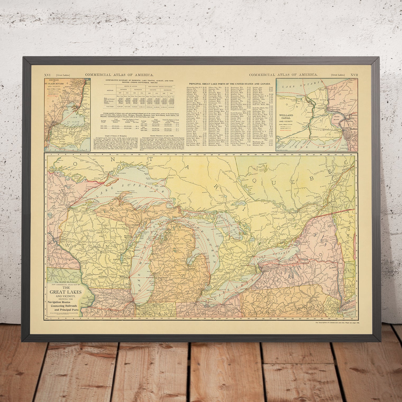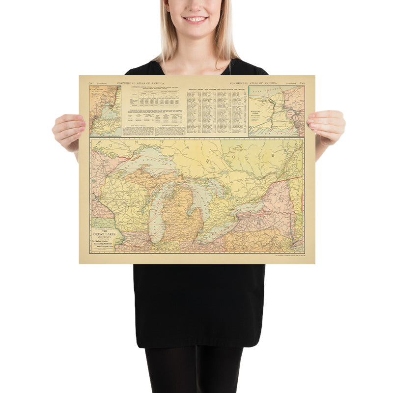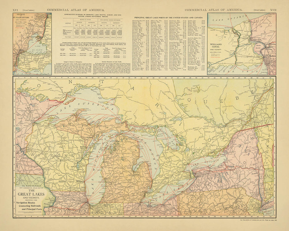 - Extra notes: inset maps highlight the Detroit–St. Clair River area and the Welland Canal, emphasizing key transportation corridors