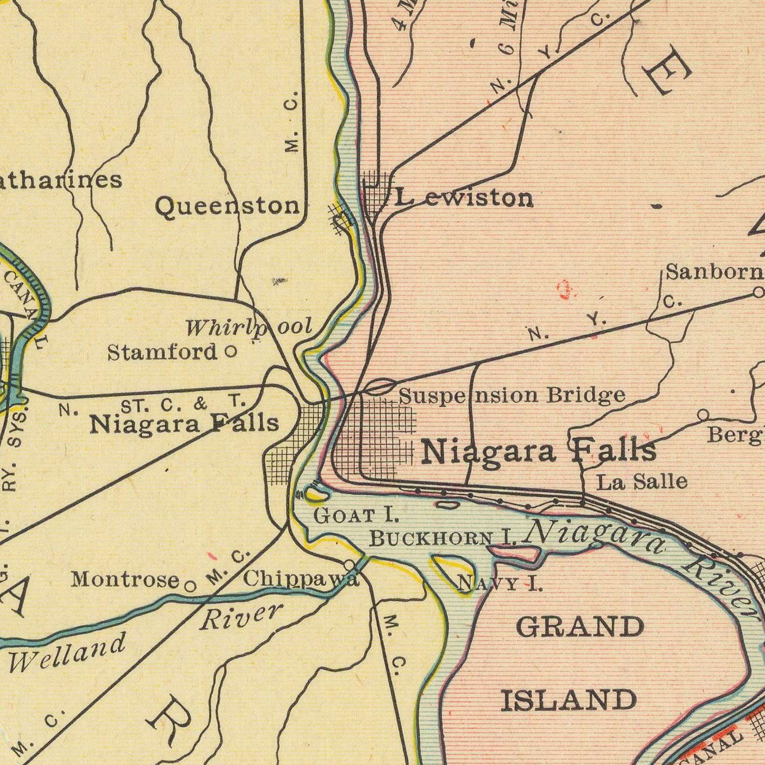 Two inset maps supply the crucial micro-geographies that move macro-economies. Around Detroit and the St. Clair River, the sheet magnifies the narrow straits that carry vessels between Lakes Huron and Erie—past Detroit and Windsor, through Port Huron and Sarnia—where currents, docks, and junctions concentrate traffic and turn time into money. The Welland Canal inset, in turn, highlights the engineered bypass around Niagara Falls, the critical hinge coupling Lakes Erie and Ontario. By isolating these choke points and connectors, Rand McNally underlines how locks, channels, and river reaches determine the cadence of the whole system, and how rail spurs knit back to the lakefront, ensuring that every berth is a gateway to the hinterland.
