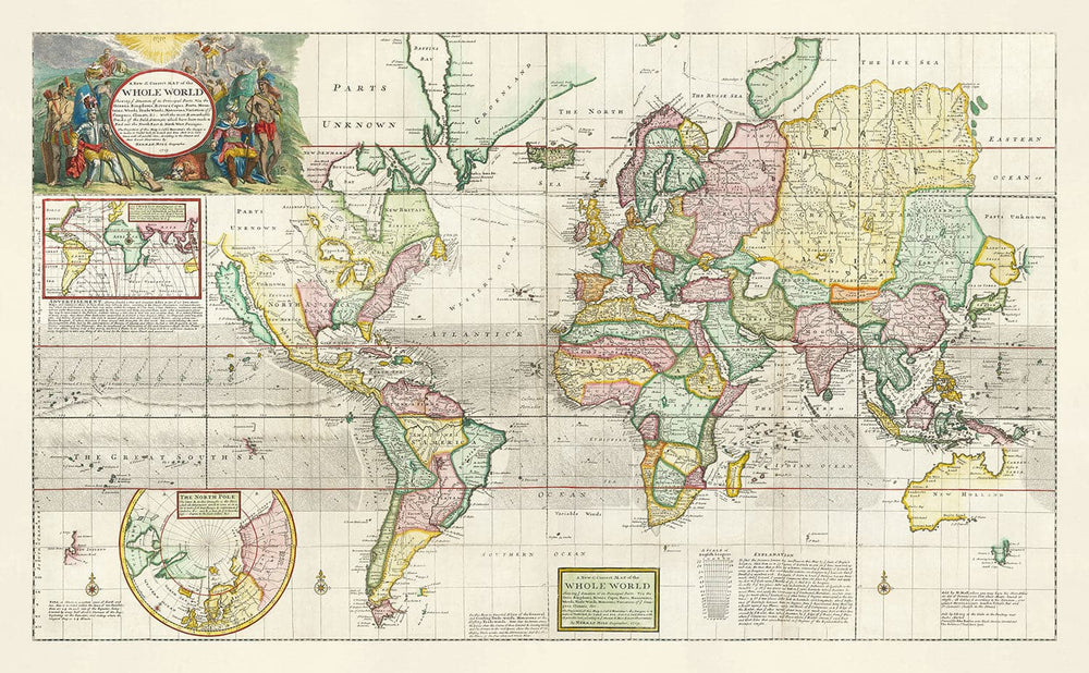 In the top left a small world map is shown with degrees of compass variation. In the bottom left is an azimuthal view of the North Pole which explorers had started to explore. There is a beautifully detailed cartouche showing elements of both the Old and New Worlds.