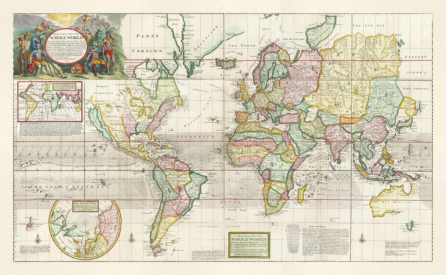 Originally published in four sheets and spanning almost 120cm (50 inches), the level of detail on this map is quite astounding. There are detailed hydrological records showing the ocean currents around the tropics. The routes of contemporary explorers such as Henry Hudson and Thomas James and the circumnavigation by Woodes Rogers.