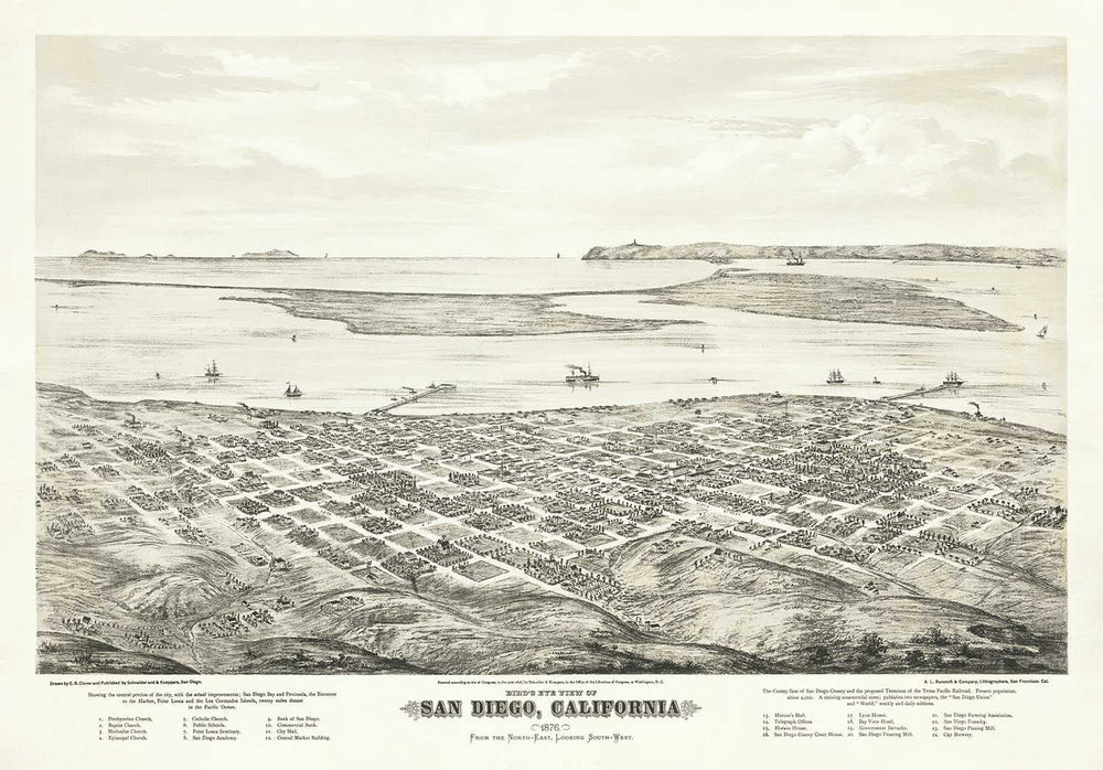 Rare Old Map of San Diego by Eli Sheldon Glover, 1876: Birds Eye, Downtown Oldtown, East Village, Cortez Hill