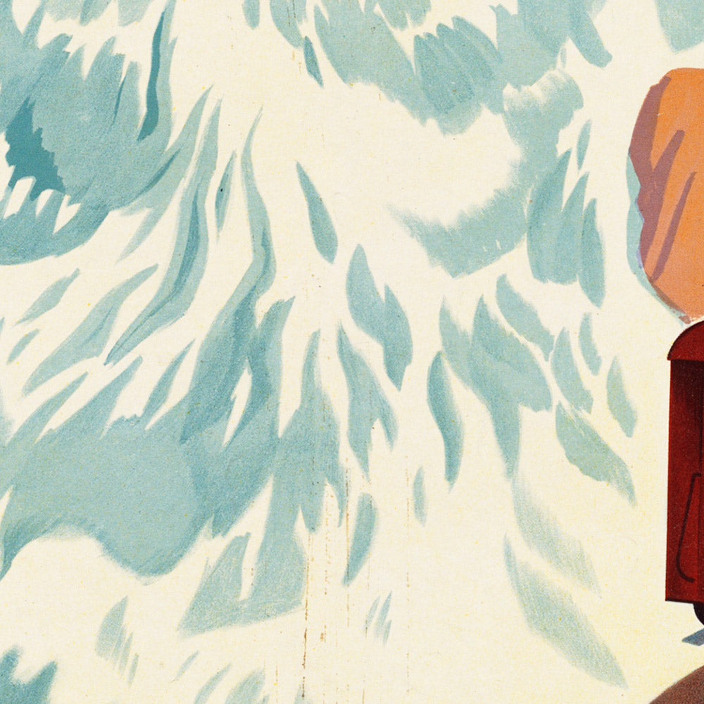 Furka-Oberalp is a classic Swiss travel poster celebrating the high Alpine route that links the Oberalp and Furka passes—a gateway to the Glacier Express and some of Switzerland’s most storied peaks and passes. Created by an anonymous poster artist working in the golden age of European railway promotion, it distills the sensation of crisp mountain air and bright winter light into a bold, modern composition. The scene is instantly evocative: a clear band of alpine-blue sky crowns sweeping white ridgelines, while warm orange light washes the slopes, and strong red title lettering anchors the design at the base.
