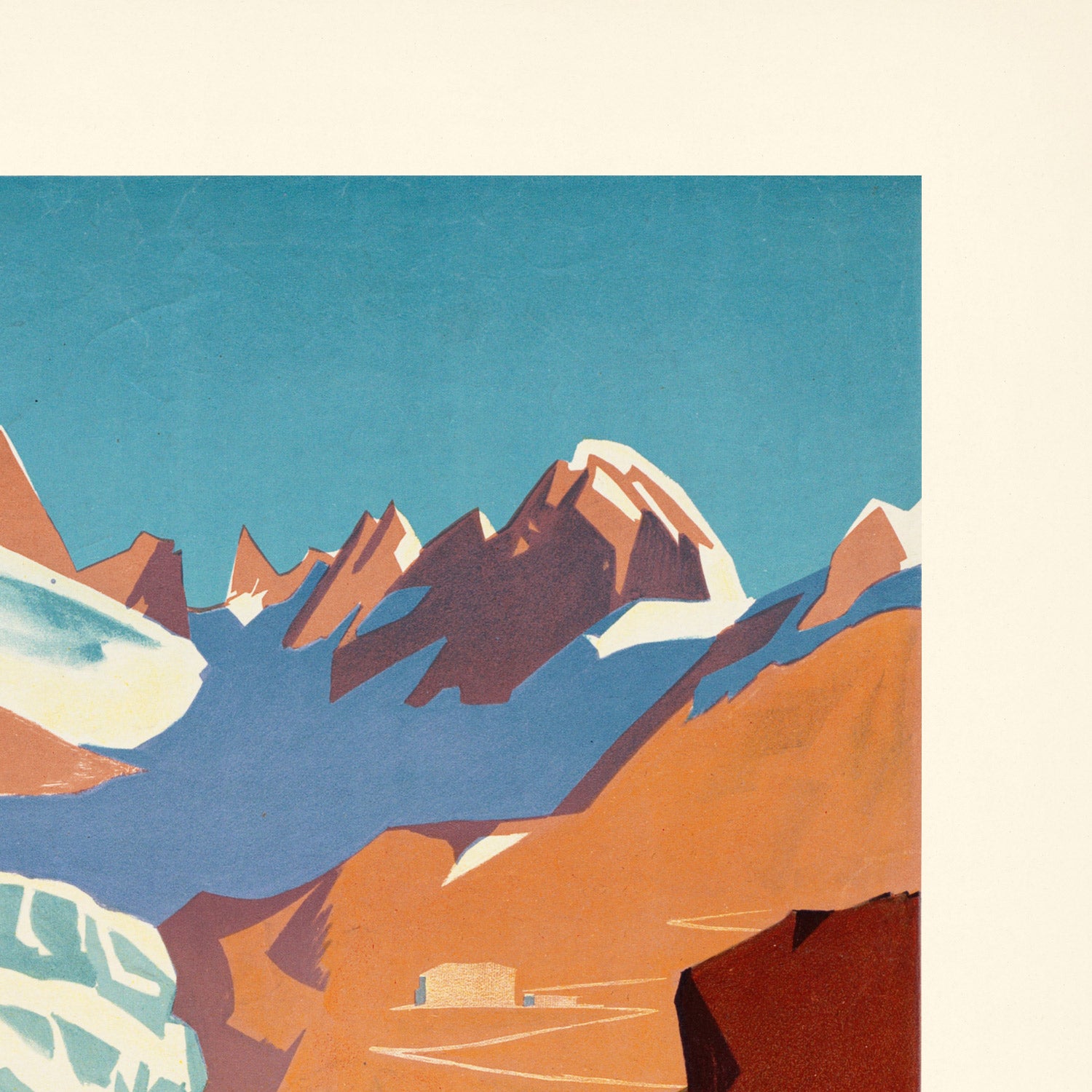 Color, style, and why to own it: The poster’s palette—white, orange, and red set against alpine blue—creates instant impact and a warm-cool balance that suits both contemporary and traditional interiors. The broad, snow-white forms act as negative space that amplifies the drama of the mountains, while the orange glow suggests sunrise or late-afternoon alpenglow. The bold red title type adds a confident, modern note that reads beautifully from across a room. It’s a timeless statement for mountain lovers, rail aficionados, and anyone drawn to Swiss modernist design.