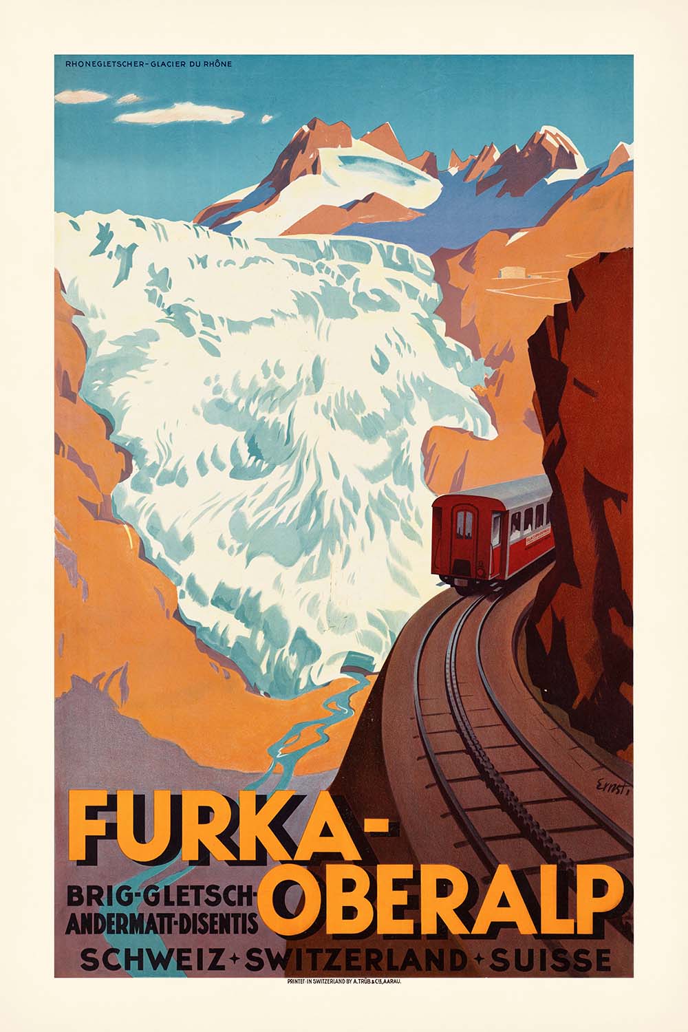 About the maker and tradition: While the exact artist of this Furka-Oberalp poster is unknown, it sits squarely in the Swiss poster tradition that flourished from the 1920s through the mid-century, when railway companies commissioned striking lithographs to entice travelers. Designers favored clean geometry, flat fields of color, and confident sans-serif typography—an aesthetic that helped establish Switzerland’s reputation for clarity and precision in graphic design.